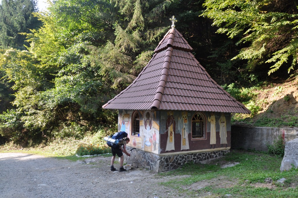 Sestoupili jsme do sedla Corbului (1568 m. n. m.), poslední části otevřeného hřebene a pak už jsme se ponořili do lesů a jeho klikatých, ne příliš pohodlných, strmých cest. Sestup byl tedy spíše útrpnou záležitostí, hlavně na kolena. Obzvláště Martin si na tohle rád stěžuje 😉 a ani tady tomu nebylo jinak. Nutno podotknout, že značná část byla po rozryté cestě s většími kameny (pravděpodobně práce dřevařů a jejich traktorů), po kterých jsme neustále klopýtali a s námahou brzdili své těžké batohy na zádech. Vojtovi se zase stala taková jiná nemilá věc, při sestupu mu totálně zalehlo v uších a nebyl s to se toho zbavit. Poslední a asi nejstrmější sestup byl lesní udusanou cestou, která ústila u potoka na dně údolí a zároveň na pevné, štěrkové cestě, kterou jsem si dobře pamatoval z předcházející výpravy. Bylo půl páté, ukazatel hlásal Turnu Rosu 5km, takže jsme měli cca hodinovou rezervu na vlak po šesté hodině.