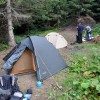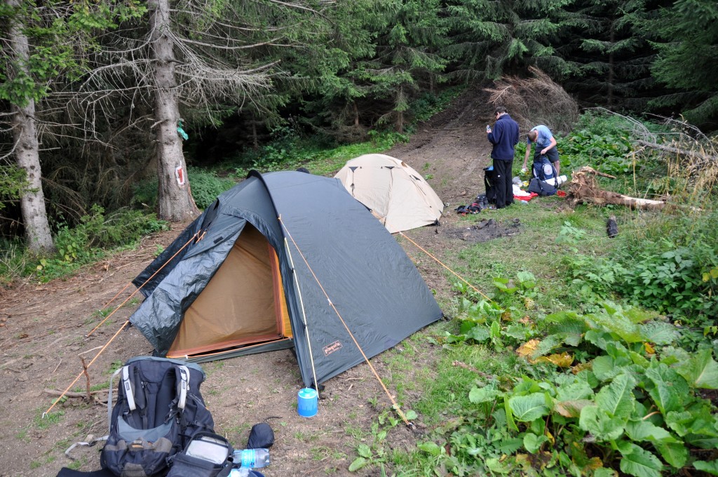 Byli jsme po dlouhém dni už docela unavení, takže jsme se na tomto úzkém, zalesněném hřebínku kolem půl sedmé utábořili. Kolem vedla rozrytá dřevařská cesta, ale my jsme byli trochu bokem, tak jsme doufali, že nebudeme muset kvůli případnému průjezdu traktoru, který opodál romanticky bafal, stany náhle posouvat. Následná večeře ve formě rýže s masovou konzervou přišla opravdu vhod (také jsme o ní poslední hodinu pochodu velmi intenzivně hovořili :-), což se nedá říct o malých muškách, které se na nás s nastupujícím večerem sesypaly a neskutečně se rozštípaly. Bohužel jsem se dostatečně obléknul až příliš pozdě a navíc bláhově nechal odhalený obličej, což způsobilo, že jsem celý nadcházející týden prožil s neskutečně poštípaným čelem a až překvapivě dlouho trvajícím účinkem svědění :-).