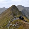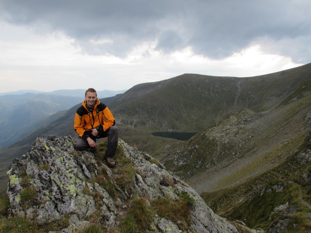 Další hřebenovkou jsme vystoupali na Vf. La Fundul Bandei (2454 m. n. m.), kde se nám otevřel krásný výhled do hlubokého údolí na západ a mohli jsme si tak prohlédnout zbytek naší dnešní trasy. Následovala moc pěkná hřebenovka směřující pod impozantní pyramidový vrchol Vf Urlea (2473 m. n. m.), byla velmi úzká a ostrá, nicméně prozatím travnatá. Další trasa vedla traverzem pod vrcholy Vf. Lui Mogos (2398 m. n. m.), Vf. La Cheia Bandei (2383 m. n. m.) a Vf. Coltul Balateni (2286 m. n. m.), odkud jsme sestoupili do malého sedla Fareastra Mare a Sambatei (2188 m. n. m.). Toto sedlo bylo moc pěkné, k romantickému táboření jako stvořené, ale nebyla zde útulna a kluci to nechtěli s poškozeným stanem riskovat. Pravda, že zrovna tady by se dal očekávat docela silný noční vítr. Zbývalo tedy přehoupnout se přes poslední dnešní vrchol Vf. Slaninei (2268 m. n. m.) a sestoupit do sedla Fareastra Mica a Sambatei (2191 m. n. m.), kde nám Češi poradili dobrou, neznačenou útulnu.