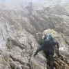První, co nás čekalo, byl výstup od plesa Caltun (2135 m. n. m.) nahoru ke spodnímu ústí Strungy Dracului – slavné Drákulovy strže, cca 100m dlouhé, strmé průrvy s řetězy, jejíž horní ústí je kousek pod vrcholem Vf. Negoiu (2535 m. n. m.). Stoupali jsme ještě v hustější mlze, ale kousek pod Stungou Dracului se to začalo protrhávat. Baťůžkáři nás předstihli a zmizeli z dohledu, takže pod strží jsme se ocitli sami. Nejprve jsme tedy minuli Strungu Doamnei, méně známého souseda Strungy Dracului a pak už se konečně dostali k našemu dnešní dopolední cíli. Byla taková, jakou jsem si jí pamatoval, jen možná o něco více „rozbořenější“. Ono není divu, velké kameny se po jejím štěrkovém podloží pohybují evidentně téměř neustále. Začali jsme šplhat a nutno podotknout, že nahoru to šlo hůře, než před lety dolů, alespoň tedy ze subjektivního pocitu. Na některých místech chyběly řetězy a občas se moc nebylo čeho bezpečně chytnout, obzvláště s velkým batohem na zádech. Stoupali jsme proto pomalu a obezřetně. Velký pozor jsme si museli dávat na pohyblivé podloží, obzvláště abychom neuvolnili větší kameny a neposlali je na kolegu šplhajícího v závěsu. Posléze jsme si už nechávali větší rozestupy, kdyby přece jen náhodou něco spadlo. Trvalo nám to cca 40 minut, než jsme se dostali až úplně nahoru. Cestou nás předešla dvojice Čechů, kteří šli tedy jen na lehko. Nahoře, na malé plošině u horního ústí strže, jsme si dali zaslouženou pauzu a pořídili nezbytné fotografie. Co je potřeba zmínit, našli jsme tam malou plechovou ceduli hlásající zákaz vstupu z důvodu padajících kamenů. Zpětně jsem si uvědomoval, že obdobnou ceduli jsem možná zahládnul i dole pod Strungou. No ale už bylo pozdě, stáli jsme nahoře :-).