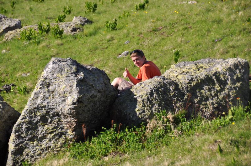 Obkroužili jsme Bogdevskou Planinu po hřebenu přes vrcholy Morava (2150 m.) a Lera (2197 m.) a přes další sedlo jsme se dostali na sousední vrchol Fudan-Brdo (2224 m.). Kousek pod vrcholem jsme našli krásné místo ke stanování. Terén byl sice plný drnů, ale sousední potok sliboval zadostiučinění ve formě ledové koupele, tak jsme neváhali a utábořili se.